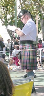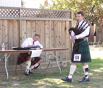 I received the schedule for the Pleasanton Games in the mail today. Mercifully, I'll be playing a little later on Saturday, not until 9:30 or so. For Friday's piobaireachd, I'm scheduled for 1:40 in the afternoon. Last night, I played on my pipes for the first time since the Monterey Games. It was peculiar to find the joints loose on my pipes from lack of use. I've been continuing to deal with mild soreness in my hands and wrists, therefore have been only playing for very brief periods on the practice chanter though still almost every day. I've been focusing on the parts of the tunes that need the most work. Boy, I sure hope I can get my act together, nine days. Lately, I've been doing more stretching and rubbing/massaging of my hands and wrists. I'm hoping that will help. Wednesday, August 31, 2005. I played with the band at practice last night for the first time in what felt like months. I was getting pretty tired and my hands/arms were getting fatigued by the end and a bit tight. I had a lesson with Jay Salter, my instructor, this afternoon, entirely on the pipes. Where I'm feeling it most is on the back of my right hand and the inside of my right forearm. We spent some time tweaking the tuning on my chanter and most of the time picking apart my three competition tunes. I need to pull out more expression in my slow march, not push the tempo and clean up my grips for the 2/4 march, and hold the low-As and hold the high-As in the first variation of the piobaireachd. Little things here and there. Nothing major, but potentially enough to keep me out of medals, especially at Pleasanton. It's a tough venue. I have been listening to recordings of my competition tunes, the piobaireachd most often, that should help. I'm feeling old. My right knee is sore (pulled ligament or something) from playing a softball game about 10 days ago and my hands and wrists are still not back to normal. Getting ready for this competition is like going to bed at 3 a.m. knowing you have to get up at 6! GAMES DAY - Day 1 I've decided that I like morning competitions versus competitions in the afternoon. I had just enough time this morning to be at odd ends. Not enough time for a serious project plus my head would be thinking about something else. My wrists were hurting but I took a Tylenol and a Motrin to help. I left Santa Cruz about 11:10 a.m., driving mostly with my left hand, and arrived in Pleasanton about 12:15. Weather was in the 80s, not too bad for this venue. Today was piobaireachd, I was to play at 1:40 p.m. I arrived over by the registration booth just in time to see Paul Llewellyn chatting with judge Rob Boyd right after his 12:10 performance. I gave them both a wave, got smiles and waves in return, and found a place to park my pipe case. I started keeping an eye out for George MacKay, a student of Jay's who's been piping for three years and was entering his first competition today. I was to help him tune up . . . if I could find him! (Jay had an obligation come up and couldn't make it.) I walked around talking to people, Kip Moralis and clan, Gary Gifford and his 12-year-old winning piper daughter Amanda, Jennifer Febre—who'd done very well at Monterey and plays for Misty Isle PB—and a fellow named John from Oregon. I eventually found George about 10 minutes before he was to play and helped him tune up. His E was definitely flat so I raised that a bit. For what little I listened to while we tuned, his technique seems pretty clean. The big disappointment for George was his outside tenor was too loose and slipped down just as he was to play for the Rob Boyd so his drones were really far out. I started warming up my pipes and things felt good. Chanter was on, drones were not locking in exactly, but got better after a little bit. I think the heat helped my hand and wrists. My fingers seemed accurate and my hands weren't bothering me that much. (Typing this, I can feel it on the inside of my right forearm.) George—who drove up in an RV—changed into shorts and a T-shirt and reappeared with a video camera and tripod to tape Mike's and my performances. That will be very interesting to see. I haven't had a performance taped since my very first—wait, no, I had Pleasanton a couple years ago taped, but I've never watched it, too painful! My first one at Monterey was pretty painful too, I only have watched that one once! In any case, this one should be educational. Mike Lindelsee was scheduled to play 10 minutes before me. Paul and I helped tune him up then off they went. I stayed to continue warming up and tweak the drone tuning for another five minutes or so then headed over myself. Don Saraceno of Oregon, who'd e-mailed me for the first time a few weeks ago walked over and introduced himself. He politely excused himself once I told him I was next. (He's a Grade IV competing piper, he knows what's up.) Mike was done and I waited for Rob to finish up the score sheet. I walked over, and being very official, he told me the tune requirements. I gave him the tune, took a few steps off, struck in and started analyzing the drones against tune snippets. It was pretty close still, hard to tell if I could improve it or not without a long re-tuning process. So I turned and started the tune. It went very well, aside from the drones which started drifting out of tune with the chanter. I stayed on the tune, felt I did well with the phrasing, pretty clean fingering, had no reed chokes. It felt good and I was happy with my performance aside from wondered how much damage was done by the drones being out, that and some slight pressure changes that I heard.