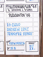 Once I was done, Rob offered that he liked that particular tune and that I'd played it well. Mike said it sounded beautiful. While waiting for the event to wrap up, I spotted Steve Megarity (reed maker and former PM of the L.A. Police Pipe Band and now PM of Misty Isle) tuning up Jennifer Febre for her piobaireachd. When I introduced myself as "Andrew Lenz" he said "oh, yeah," though I'm not sure if he was just being polite. Steve was one of the instructors at a one day WUSPBA workshop that I attended a few years back—not that he knew me from a hole in the ground. We had a nice chat about the Misty Isle Pipe Band and the challenges of tuning in the heat of Pleasanton. That, and the Worlds last month, and I asked about his reed making business. Friendly guy, ended up shooting the breeze with Mike and George too since they strolled over to join us. Waiting for results, I hung out with a variety of folks. I was kidding Don S. about his making the mistake of asking for the score sheets too early. Gotta give those organizers their breathing space! Finally, the top three finishers for the Leet "B" (not ours) were stapled to the fence—unfamiliar names. After another 10-15 minutes, Leet "A" went up. Rats. No one I knew, including myself. The next question is whether I'd managed to get a Top-5 finish or not. Time to get the score sheet. My Piobaireachd Adjudication Sheet: Place: Pleasanton, Drones close & good balance with chanter. Nice tune, Andrew. Score: 62 Placing: [Blank] Judge's Signature: <Robert Boyd> I got asked by one of Kip Moralis' group, Shep, how I did. No placing. "Bit of a dry spell for you, isn't it?" "Yep." I think I may be in the market for a new chanter reed soon. One that's a little harder to overblow. Now that I've aggravated my hands by typing this up, I go back tomorrow morning! I have my doubts that I'll place in anything tomorrow. But I like to think that I've got a reasonable chance to place in the slow march—and I've been surprised in the 2/4 March in the past. Who knows. Charlotte, my daughter turns 7-years-old tomorrow. Time marches on! Day 2 I was up at 6:50 and on the road by 7:40 with a Motrin and Tylenol in my system. No minor accidents on the road like yesterday, so it was a little smoother and slightly quicker trip. I arrived about 8:40 or so. It wasn't too hot which was nice, but it was early yet. I checked the registration booth for the platforms at which I'd be playing and ran into Mike Lindelsee along with his wife, son and daughter. We sought out the platforms (7 & 8 for me) and also found our instructor Jay Salter along with George. George was to play very soon so Jay was helping him. I went off to find a spot to warm up as it was now about 20 minutes to my time of 9:24. I came back about 10 minutes before my event and Jay tuned up the drones and checked the chanter. The temperature was starting to climb a bit. For the 2/4 March, I was to play for Scott MacDonald who also judged my 2/4 in Monterey about a month ago. While Scott was finishing up his write up of Walt Innes (who'd slipped in before me though I was two minutes early), Joe Fitch, of the Macintosh PB, suggested I double-check my drones. Sure enough with the temperature rising, they'd already shifted. He touched them up and I walked over to Scott. We exchanged 'good morning's and 'how are you's, I gave him my tune. I tried keeping it slower and expressing it better. It wasn't exactly what I wanted but I got through it. Scott invited me over and provided me with a lot of specifics. "I'm getting to know your playing and this was much better than last time." He gave specifics for improving: cut the B more after the initial A in the line, don't crush the grip—raise the D finger higher, hold the C longer, hold the longer notes for more expression. Watch the overblowing of the high hand, try taping down the High-A and F notes, see if that helps.