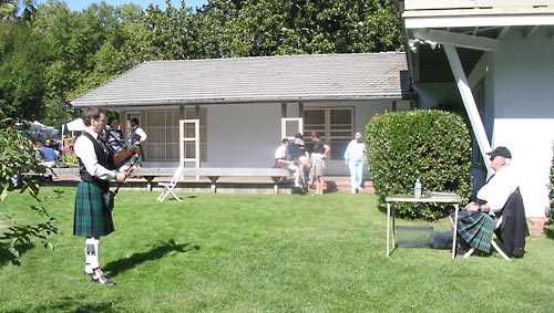 | Playing Braes of Lochiel while Jimmy McColl listens on. In background, Jay talks with a former student Morgan Taylor. Young Prince Charles Pipe Band piper Lane Olson sits listening with a friend and her mother Missy. Betty, Jimmy's wife, steps down to the grass. |