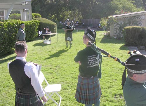 I went to give Jimmy McColl my tune and . . . I forgot the title. Hmmmm. Duh. "Battle of Auldearn, number one." The drones sounded pretty good from Jay's tuning a few minutes earlier, I didn't feel any need to change them. I started into the tune and again, it wasn't like Pleasanton where I could just focus on my own solo piping—no organizing, no band, no funky reed, etc. I think I've played Auldearn so many times now, I could play it in my sleep. I played the tune solidly, though I wasn't feeling that 'flowing with the music' as much. I also had some saliva building up during the variation—I'd just eaten lunch—I was concerned, but I held on.