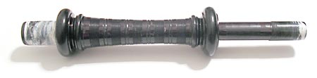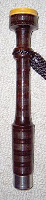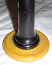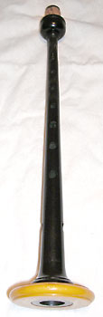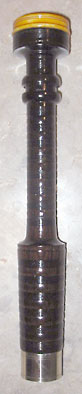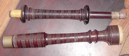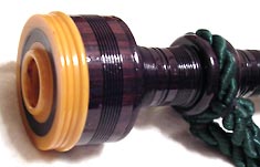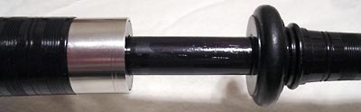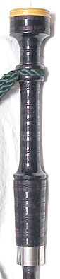 Also in mid-October 2006, Alec Smith of the Isle of Wight, England (a former turner for David Naill & Co.) pointed out the similarities between a set he has and my set. He picked the set up on eBay and the ebony chanter included with the pipes was stamped "R Gillanders, Forfar" indicating a possible, but not sure, link of the drones themselves with Gillanders.) If you look at the company history page of the Gillanders and McLeod website, they tell that Robert Gillanders was a turner with the Thow Brothers in Dundee until he left in 1926 to start his own company Robert Gillanders - Bagpipe Makers. Right around 1956 the shop moved to Forfar and the name was changed to R. Gillanders & Son. Assuming the chanter belongs with Alec's pipes, the tenor drone in the photo below would have been made between 1956 and 1972 at which point Iain McLeod bought the company and changed the name to Gillanders & McLeod.