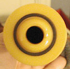 It's 2-7/8" across. The outer diameter of the wooden ring is 1-3/8", the opening is 7/8" The side holes on the chanter start 2-3/16" up from the top of the sole and are just under 3/8" in diameter. You may notice that the wood has shrunken from the imitation ivory sole, this is due to the fact that it hasn't been played or oiled in over a quarter century.