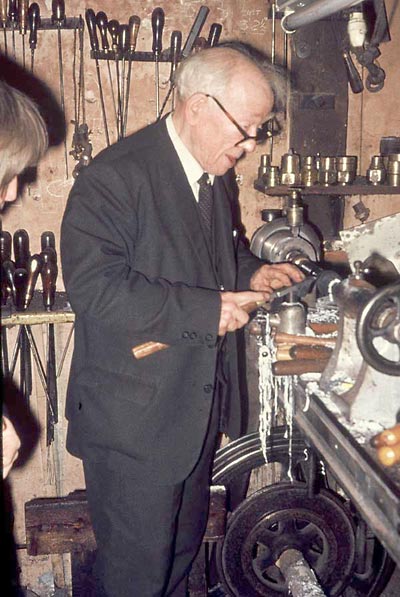 | Andrew Ross at the lathe in his shop in Edinburgh in 1976 or 1977. Photo by Josef Hartmann-Virnich (of Cologne, Germany). Used by permission of his son Andreas Hartmann-Virnich (whose nose is seen at the left of the photo). |