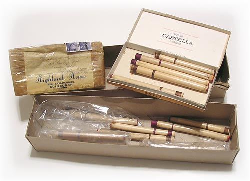 Now, in the box was not a practice chanter—I inherited a Hardie practice chanter, not a Lawrie, go figure—instead was a variety of cane drone reeds and a small thin box labeled "Wills Castella Cigars" containing five more cane drone reeds. Of particular interest in the box was a 3"x6" flat package with two more cane drone reeds, from Highland House, 328 Lawnmarket, Edinburgh EH1 2PN. You can just make out part of the postmark on the two "9P" stamps, "25 JA..." so January 25th. The rest of the postmark is long since gone on the yellowed cellophane tape—or the ink could have just smeared off in mailing.