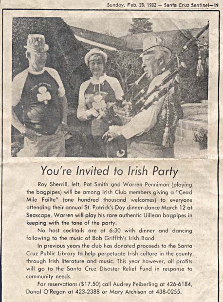 Andrew Lenz's Grandfather and the "Rare Uillean Bagpipes."Here's an article from 1982 announcing an charity event featuring Warren Penniman, my grandfather, who was 68 years old at the time.
