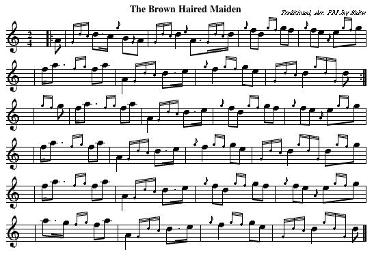 Here's a screen shot (work screen) of the now-disontinued Barfly program for the above tune: An example of the above tune as much nicer resulting printable sheet music (PDF format, 26K) is available which was generated via abcm2ps. (We will discuss abcm2ps later.) You can also make the beams perfectly horizontal, which is another option. Sections of an abc notation tune. An abc tune is composed of two sections, the header and the body of the tune. The header contains the specifications for the tune and the body contains the musical notes themselves. The Header. I'll break down the header line by line, beginning with the first. X:1 The above line assigns a number for that particular tune in the file. Even if there's only one tune, always include this line. The next tune in the file would typically be labeled "X:2". All tunes in a file need to have unique integer numbers—though not all software packages enforce the unique number requirement, it's good practice to follow the rules. T:Brown Haired Maiden Title. If you also want a subtitle, use two "T:" lines like this: T:Brown Haired Maiden N:Very common tune. Notes. This is just a means to add general comments in the abc file. It won't show up in any printed scores. Z:Transcribed Sept. 28, 2003 by Andrew T. Lenz, Jr. Transcription notes. Another line that doesn't show up in any printed scores. C:Traditional, Arr. PM Jay Salter Composer. As with the title, if you wish to include a second composer (like giving yourself credit for the transcription work), just add a second "C:" line. R:March Rhythm, e.g., Jig, Reel, March. There isn't a set group of categories—that is, you can put whatever you want here—though sometimes if an authoring program recognizes the stated rhythm, playback may be improved. Your stated rhythm often appears on the upper left of the printed score. M:2/4 Meter or time signature. You can also include M:C for common time (4/4) or M:C| for cut time (2/2). L:1/8 Now this gets a little more interesting. This line is used to modify the default note length. The default note length will be an eighth note (1/8) if the value of the meter is equal or greater than 0.75 (i.e. 3/4 or 4/4 time), or it'll be a sixteenth note (1/16) if the value is less than 0.75 (i.e. 2/4 time). The "L:" line is used to either make this default explicit or change it from the default. For instance, if the tune has a lot of 1/16 notes, you'll probably want to include the line "L:1/16". For notes of values other than the default value, you'll have to add a modifier in the body of the music to change that note's value—the less of these modifiers, the less work, so plan ahead. You could also put an L: in the middle of a tune to change the default length for the remainder of the tune, if for some reason this saved a lot of typing on your part. Q:1/4=80 Tempo. We could just do Q:80 , but then the tempo would be 80 notes per minute of whatever the default note length happens to be. By including a specific note length, we can set it to something other than the default or simply be very clear as to what we want, in this example, a tempo of 80 quarter notes per minute. Depending on the program, this may—or may not—print out on the score. It's handy for playback in your software, but you might want (or need) to remove it or "comment it out" to omit it from the final score. K:HP Key. "K:HP" follows piping tradition by skipping the key signature on the music. The alternative is "K:Hp" which marks the stave with F-sharp, C-sharp and G-natural. Either one of these, HP or Hp, will make all the melody stems to point down and gracenote stems to point up—plus it will keep the gracenotes from being tied to the following melody note! (See Tweaking abcm2ps output below for other things to do to make sure you get conventional bagpipe style output.) By the way, the point of using the conventional codes for non-printing notes/comments (such as Z:) is that you could search though an abc database looking at specific fields—just a way of possibly helping refine a search later on. Other codes are A: (area of tune origin), B: (book), D: (discography), H: (history), S: (source). There are some others you can investigate if you wish to pursue using these codes. Tune basics for the body of the tune. A single line of abc notation will equal a single line on the resulting sheet music. If an abc line is getting too long, but you still want it on a single line on the output, insert a "continue line" indicator \ and then continue on the next line. (Anyone familiar with the Unix command line will feel at home with this!) Or if your line is getting too long in the output, simply break up your abc notation onto another line at the end of a bar and that will be reflected as a line break in the output as well. Feel free to leave space around your bar lines or groups of notes to improve readability, since in that context the spaces are ignored in abc notation. Though keep in mind that if you wish to have a series of notes all connected with one beam, there cannot be spaces between the notes. Likewise, if you wish to have adjacent notes' beams not connected, add a space between them in the abc notation. A critical thing to know, blank lines indicate the end of the tune. But since we can't use blank lines to improve readability, we can separate the parts of a tune vertically by putting in the "continue line" indicator \ where you would normally leave a blank line or where you would otherwise want to end a line in the abc notation, but not in the output itself. Gracenotes are indicated by placing the notes between curly braces: {}. So a High-G gracenote would be indicated by {g} and a light D-throw would be: {Gdc}d . Barlines are indicated by the pipe symbol | . The tune ends with a double bar: ||. A double bar with the first of the two bars lighter than the second (thin/thick) is indicated by |] . A double bar with the second of the two bars light than the first (thick/thin) is indica