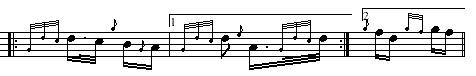 Repeats. Simple part repeats are pretty easy, just place a |: at the begining and a :| at the end of the part. If the end of one repeated part bumps up against the beginning of another repeated part, it can be indicated by :||: (clearest) or also by :: (shortest). Repeating from a specific point is done by using a square bracket followed by the repeat number: [1 and [2 . For instance: |: {Gdc}d3/2c/2 {g}B{G}A |[1 {Gdc}d2 {e} A3/2{Gdc}d/2 |[2 {g}fd {gf}gf || would appear on your screen as: