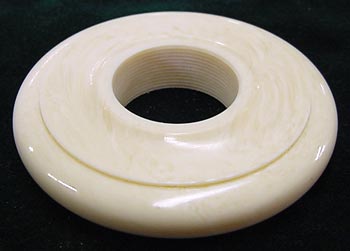The various synthetic ivories will commonly either have solid color or a swirl of colors. Some old simulated ivories were celluloid (see examples below) or even casein. Many plastics, particularly older formulations, turn from off-white to a dark orange (often referred to as "pumpkin" by pipers) with age, some even within 10-15 years. Vegetable ivories also exist and these can be tested by experts using a minute application of sulfuric acid. An excellent lab test for differentiating materials is FT-IR spectroscopy—but this is not something found on every street corner!