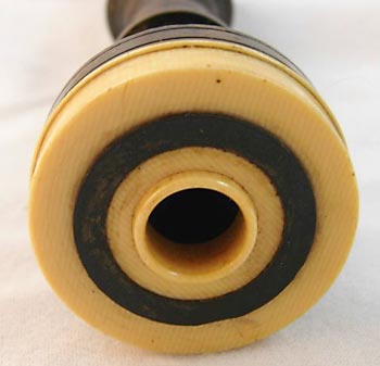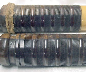 Since chanters can come and go, a name on a chanter with the bagpipes may mean nothing. Bagpipes must be visually inspected in great detail by a knowledgeable person for a good identification. This involves either taking or shipping a set of bagpipes to an expert or many very detailed and clear photographs and measurements. A poor man's approach is to post photographs and measurements to a website then post links in an online bagpiping forum, such as BobDunsire.com's Technique & Instrument forum Much like doctors, if you can afford it, it's always a good idea to get two expert opinions for identification. Experts coming to different conclusions, particularly on vintage bagpipes, is not all that uncommon. For instance, one set was identified as made by Glen, but later correctly identified as MacDougalls. Plus turners—the craftsmen shaping the parts on a lathe—occasionally moved from shop to shop, there are stories of some even working a few days each week at one shop and the remaining days at another. Obviously, this can make identification problematic. (You may be interested to read about my adventures identifying my bagpipes.) "How do I look for problems?" You'll want to inspect your set very closely, inside and out. Use a light to peer down the bores of the bagpipe looking for signs of cracks or repairs or other defects. Also determine if the bores are circular and haven't shrunk or worn down to an oval shape. Inspect the outside critically as well. Check to make sure the mounts and decorative woodworking matches from section to section. If they don't match, a part may have been replaced at some point. Check for warps by taking each drone section and rolling it on a smooth surface. If any part appears to wobble, it's not straight. If a warp is significant, it will affect the value.