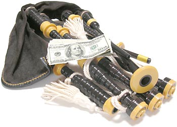 Most standard modern (last 40 years or so) wood bagpipes from a known maker will sell used for between $600 and $900, a lot depending on whether it comes with a chanter, drone reeds, drone cords, case, tied-in bag, bag cover, etc. Some are sold simply as "sticks and stocks," that is, drones and stocksno chanter or other accessories. A good set of silver and ivory mounted pipes from the early 20th century would likely sell for $3,000 to $6,000, more for immaculately engraved silver and/or a highly desired maker. Maybe add another $1,000 or $2,000 for a 19th century set. The most desirable sets in excellent condition typically top out around $8,000. Sometimes you'll see sets for over $10,000 but this is exceptionally rare. Bagpipes made in Pakistan are notoriously inconsistent at best, unplayable at worst. These compose most of the low valued bagpipes. Other low valued pipes would be sets which are damaged to the point of compromised sound quality, or ones that, while they sound good, have substantial cosmetic damage that would be easily visible to a nearby listenerthough sometimes this damage can be repaired. Characteristics that add value: Characteristics that detract from value: