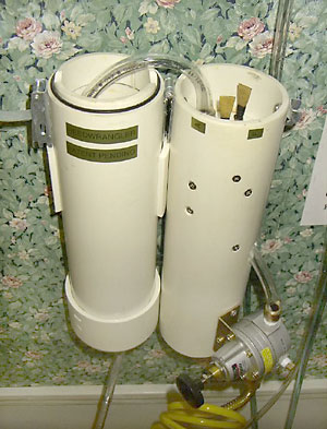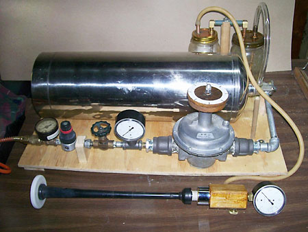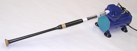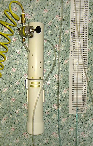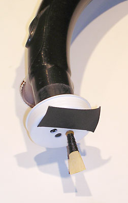 I had turned off the compressor after the tank (about 50 gallons/190 liters) was full, so I just let this contraption run until the tank drained. I did this at work after closing and just let it do its thing. With this set-up the tank emptied in about an hour . . . equal to some piobaireachd practice. I did this a couple days in a row and it greatly helped the reed ease up. Ideally, you'd want to tape the chanter to play different notes for each treatmentsuch as High-A, D, Low-A, etc. You don't want to let the reed run more than a person would typically practice, in other words, don't get impatient and run the reed overnight. I tried that once and the reed closed up and was unplayable. The reed was able to be a least somewhat resurrected by coaxing the blades back open by pinching the sides for weeks with a spring-loaded clipI still have the reed, it recovered and is functional after its grueling all-night torture test. That said, don't count on an overplayed reed surviving. Oh, and being that I didn't want anyone to think that a burglar alarm was going off at work, I put the chanter in a tube—the airbrush hose run through a slit cut in the plastic cap—with padding around the sole end and loose balled up paper at the open end of the tube. Then I put that in a larger open tube, followed by another tube with one end sealed. All this to just dampen the sound some. You don't want to put it in a completely sealed tube or the back pressure will cause the reed to shut off.