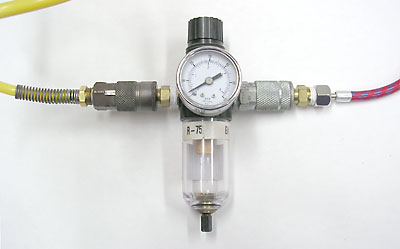 I made a chanter cap (a.k.a. "dry stock") out of PVC, drilled a hole in the top and added a fitting so I could attach it to an airbrush hose. It connected in the following order: To make the chanter cap, the PVC pipe I used had a 13/16" (20mm) inner diameter and a 1-1/6" (27mm) exterior diameter. I drilled a hole in the plastic end cap to fit a male/male metal fitting to attach to the air line. The chanter is hemped and wrapped with Teflon tape for an airtight fit with the cap. The cap doesn't really need a locking nut since the fit should be very snug; in my case, I'd made the cap previously to use as a typical true chanter cap, hence it already had the plastic nut. I wiped the exposed blades of the reed liberally with water using my finger, let it sit for about 10 seconds, then wiped off any standing moisture. I installed the reed in the chanter and put on the cap. I hooked up all the hoses then gradually increased the regulator pressure from zero up to the point where the reed kicked in a High-A, then I dropped the pressure to just above reed cut-out. (Some experimentation was required to determine the lowest possible setting on the regulator for this.) I found that if I left the reed sounding at the higher pressure, not too much later it closed up and stopped sounding. If I dropped the pressure, the reed would sound indefinitely.