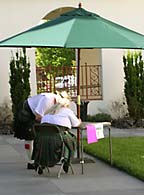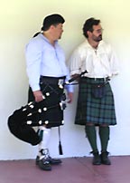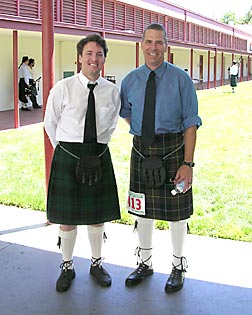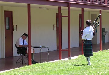 Here's what was on my Slow Air WUSPBA Adjudication Sheet: Contest Site: Campbell H/G, Date: 6-26-04, Name: Andrew Lenz, Comments: Nice playing! Points Awarded: 84 Judge's Signature: <Janice E. Richey> I felt my slow march event went pretty well, though I was losing my lip for the last half of the tune! I felt I didn't hold the long notes long enough, and this was reflected on my sheet. I didn't have much time to muse as my 2/4 March event was scheduled for 9:12. Here's what was on my 2/4 March WUSPBA Adjudication Sheet: Contest Site: Campbell, Date: 6-26-04, Name: Andrew Lenz, Tone and Tuning: Good potential, work on exercises, especially for your grips. Points Awarded: 68 Judge's Signature: <Liz Steuber> I was not feeling confident at all for my 2/4, I was worried a bit about my lip after the slow march. I started out too fast—which Jay Salter, my instructor, had warned me about—which was reflected in the judge's comment about the grips. I had tried to start slow, but away it went! When I got into the second line of the second part, I realized that I wasn't sure if I'd accidentally played the first part three times! I figured I'd press ahead, which I did, played the second part one time from there out and moved on into the third part. I felt inconsistent in my tempo—i.e. "don't rush the pick-up notes"—I still need work there. But, at least, my first 2/4 attempt is now part of an experience foundation. Just a quick side note on the comment "Chanter - okay, maybe a bit flat." In a band situation, a chanter can be flat—when compared to a master chanter. In solo piping, a chanter really can't be flat—a note can be flat or sharp relative to the other notes, but the whole chanter can't really be called flat or sharp as that is an arbitrary opinion regarding what is the ideal pitch. This was the judge's pipe major experience creeping in a bit into a judging situation. With hindsight, I imagine the judge would agree. I hung around with Paul Llewellyn (also in S.C. P & D) and his nephew Chris for a while, giving WUSPBA time to get the results tabulated. We migrated over, and found I'd placed 3rd in my leet of about 7-10 pipers—there was a "3" written in the upper right corner of my sheet—Zach had placed 2nd, so we'd be in the playoffs. I would play first, Tom Jenkins second, Zach would play third, followed by three more pipers, all at Table 4. Kip was moving on to his 2/4 March playoff at Table 3. Once the Grade III events were complete, the WUSPBA folks posted times for the two Grade IV playoffs, my time was 11:10. It ended up starting about 20 minutes late. "Piping doesn't rate a golf cart," it was explained to me and the judges had a ways to walk from the registration tent to the competition venue tucked in between a series of buildings. I retaped my F a bit, based on Jan Richey's comment. I helped Zach tune up again—as a matter of fact, if he hadn't have borrowed my cell phone to call his dad earlier, I wouldn't have been able to call his dad to tell Zach was in the playoffs! I felt pretty confident for the event, I knew I could play better than my first attempt and hold those notes for more expression.
