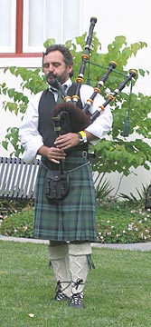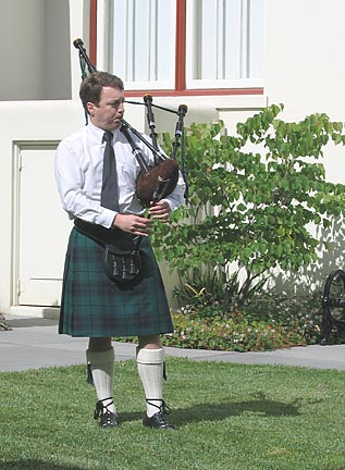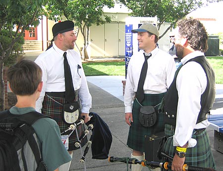 We made our way over to the registration tent and happily found that Tom had taken 3rd place in the 2/4 event. We were pointed to the schedule board with all the placings marked out. I was shocked and got a sick feeling in my stomach. I hadn't medaled at all! (Ok, another bit of irony here. Shocked that I didn't medal.) I was at least a bit relieved to see a "4" circled on my 2/4 judging sheet, that is, one place behind Tom. I was still reeling a bit about the slow march. I had felt really confident with it, though I have to say, I didn't hear the other pipers play. Sigh. Ah, well. At least, I knew that I played pretty darn well and I was happy with my performance. I had presumably lost it on expression and not technique or any dumb errors, which is a bit of a surprise. Paul placed a few points higher than I did in the slow march, Paul is continuing to improve. Mike finished respectably with a score of 69 in his only event, the slow march. Ron and I were in his car and on our way back to Santa Cruz by 11-ish. I called and left a message with Jay telling him that Paul and I got skunked and that I'm going to have to get a bit more serious and start recording myself. I got a call back from Jay a couple hours later with a "What happened?" It's Jay's feeling (and mine) that I should be placing in every event these days. Success breeds expectations! He said placing 3th then 4th in the 2/4 at two competitions was consistent, but the slow march should have been better. We'll see what we can do in the next six weeks or so before the Monterey Games. Regardless of how things turned out, it was an enjoyable day. The competition was quick—we were in and out in about two hours (plus fairly brief travel, of course). I played reasonably well with no absent-minded mental errors. I tuned my drones spot on. I got to meet Jack Lee. (Heck, even Ron walked over later and introduced himself to Jack when I wasn't looking.) I got to hang around with other pipers I that know. Time to get more technical with the music timing and stop coasting in that respect. Jay and I will be picking apart my competition tunes when he gets back in town. Next up . . . Monterey!