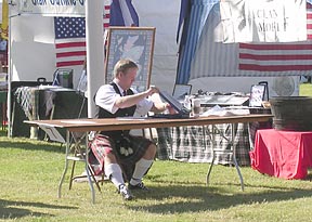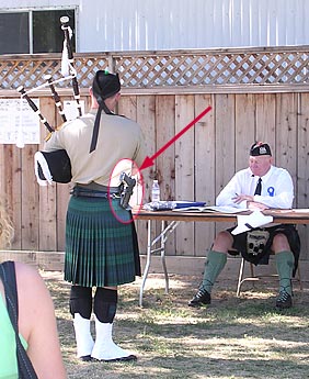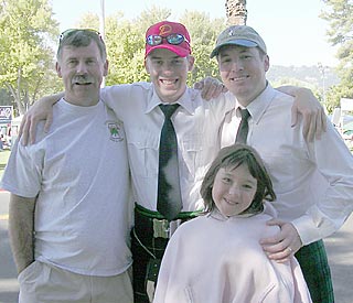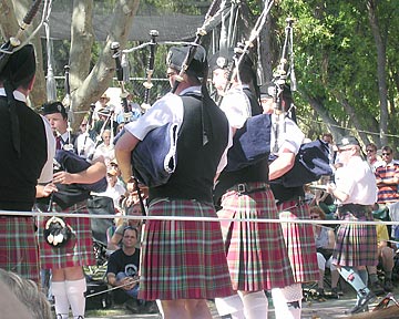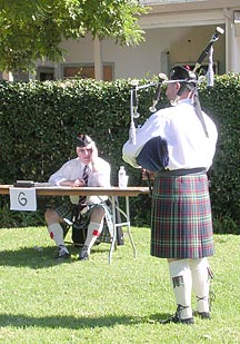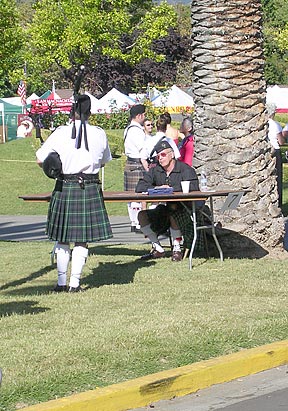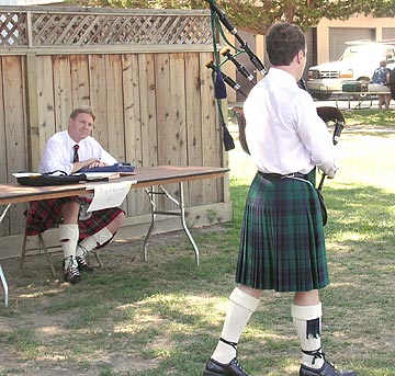 I received the schedule for the Pleasanton Games in the mail today. Mercifully, I'll be playing a little later on Saturday, not until 9:30 or so. For Friday's piobaireachd, I'm scheduled for 1:40 in the afternoon. Last night, I played on my pipes for the first time since the Monterey Games. It was peculiar to find the joints loose on my pipes from lack of use. I've been continuing to deal with mild soreness in my hands and wrists, therefore have been only playing for very brief periods on the practice chanter though still almost every day. I've been focusing on the parts of the tunes that need the most work. Boy, I sure hope I can get my act together, nine days. Lately, I've been doing more stretching and rubbing/massaging of my hands and wrists. I'm hoping that will help. Wednesday, August 31, 2005. I played with the band at practice last night for the first time in what felt like months. I was getting pretty tired and my hands/arms were getting fatigued by the end and a bit tight. I had a lesson with Jay Salter, my instructor, this afternoon, entirely on the pipes. Where I'm feeling it most is on the back of my right hand and the inside of my right forearm. We spent some time tweaking the tuning on my chanter and most of the time picking apart my three competition tunes. I need to pull out more expression in my slow march, not push the tempo and clean up my grips for the 2/4 march, and hold the low-As and hold the high-As in the first variation of the piobaireachd. Little things here and there. Nothing major, but potentially enough to keep me out of medals, especially at Pleasanton. It's a tough venue. I have been listening to recordings of my competition tunes, the piobaireachd most often, that should help. I'm feeling old. My right knee is sore (pulled ligament or something) from playing a softball game about 10 days ago and my hands and wrists are still not back to normal. Getting ready for this competition is like going to bed at 3 a.m. knowing you have to get up at 6! GAMES DAY - Day 1 I've decided that I like morning competitions versus competitions in the afternoon. I had just enough time this morning to be at odd ends. Not enough time for a serious project plus my head would be thinking about something else. My wrists were hurting but I took a Tylenol and a Motrin to help. I left Santa Cruz about 11:10 a.m., driving mostly with my left hand, and arrived in Pleasanton about 12:15. Weather was in the 80s, not too bad for this venue. Today was piobaireachd, I was to play at 1:40 p.m. I arrived over by the registration booth just in time to see Paul Llewellyn chatting with judge Rob Boyd right after his 12:10 performance. I gave them both a wave, got smiles and waves in return, and found a place to park my pipe case. I started keeping an eye out for George MacKay, a student of Jay's who's been piping for three years and was entering his first competition today. I was to help him tune up . . . if I could find him! (Jay had an obligation come up and couldn't make it.) I walked around talking to people, Kip Moralis and clan, Gary Gifford and his 12-year-old winning piper daughter Amanda, Jennifer Febre—who'd done very well at Monterey and plays for Misty Isle PB—and a fellow named John from Oregon. I eventually found George about 10 minutes before he was to play and helped him tune up. His E was definitely flat so I raised that a bit. For what little I listened to while we tuned, his technique seems pretty clean. The big disappointment for George was his outside tenor was too loose and slipped down just as he was to play for the Rob Boyd so his drones were really far out. I started warming up my pipes and things felt good. Chanter was on, drones were not locking in exactly, but got better after a little bit. I think the heat helped my hand and wrists. My fingers seemed accurate and my hands weren't bothering me that much. (Typing this, I can feel it on the inside of my right forearm.) George—who drove up in an RV—changed into shorts and a T-shirt and reappeared with a video camera and tripod to tape Mike's and my performances. That will be very interesting to see. I haven't had a performance taped since my very first—wait, no, I had Pleasanton a couple years ago taped, but I've never watched it, too painful! My first one at Monterey was pretty painful too, I only have watched that one once! In any case, this one should be educational. Mike Lindelsee was scheduled to play 10 minutes before me. Paul and I helped tune him up then off they went. I stayed to continue warming up and tweak the drone tuning for another five minutes or so then headed over myself. Don Saraceno of Oregon, who'd e-mailed me for the first time a few weeks ago walked over and introduced himself. He politely excused himself once I told him I was next. (He's a Grade IV competing piper, he knows what's up.) Mike was done and I waited for Rob to finish up the score sheet. I walked over, and being very official, he told me the tune requirements. I gave him the tune, took a few steps off, struck in and started analyzing the drones against tune snippets. It was pretty close still, hard to tell if I could improve it or not without a long re-tuning process. So I turned and started the tune. It went very well, aside from the drones which started drifting out of tune with the chanter. I stayed on the tune, felt I did well with the phrasing, pretty clean fingering, had no reed chokes. It felt good and I was happy with my performance aside from wondered how much damage was done by the drones being out, that and some slight pressure changes that I heard.