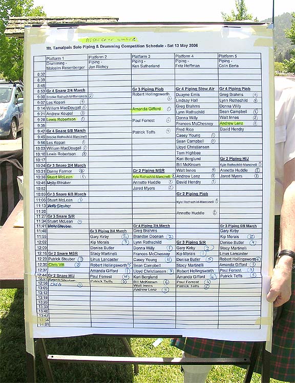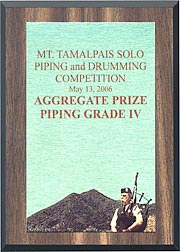 The next event was the Slow March. Fritz Hoffman, who judged my piobaireachd last year, was at Platform 3 for my 10:38 time. I was to play next to last out of the sixteen pipers who signed up. The routine was similar to the piobaireachd. Tuned, not super happy, but it was the best I could do at the time. I played the tune, no mistakes. Fritz is one of those judges who keeps a practice chanter (PC) at his table to point out areas for improvement in the competitor's performance tune. The PC didn't come out like last year. We did talk about my website and my drone sound and make of pipes for about a minute, but that was it. Walt Innes and I hung out for a while waiting for the piobaireachd and slow march results. My Slow March Adjudication Sheet: Games: Mt. Tamalpais, Date: 5/13/06, Event: Slow March Bagpipe: Nice sounding drones but not T+E: Very nice fingers. Sometimes feeling you were careful. Exp: Watch straying from the beat trying to gain Competitor's Performance Level: Place Awarded: 3 Judge's Signature: <Fritz Hoffman> From the comment about straying from the beat, one could say I was playing the tune more as a slow air than a slow march. I was happy enough with 3rd in the slow march, it was an improvement over 5th last year. That's me, Mr. Cut-Throat Competitor, happy with something other than 1st place. (If you've read my previous journals you know I'm being facetious about being cut-throat!) Sean Campbell took 2nd and Walt Innes took 4th place—now, this set up an interesting dynamic. The first place winner in piobaireachd didn't place in the slow march and vice versa. This meant that going into the final event, the 2/4 March, only Sean, Walt, and I had a chance to win the Grade IV aggregate medal. The three of us laughed about it a bit. We see each other every year on the "circuit," so it's not like we're strangers.