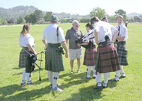 After Fritz' comment on the upper hand being sharp, I knew I was going to have to play around with the chanter tuning. I tried pulling the reed out of bit to drop the top hand, but it made the High-A even flatter than it was already, so that was ruled out. I pushed the reed back in and taped the holes down a bit more as needed. A piper by the name of Casey Young introduced himself and said some nice things about this website. Casey won the Slow March and later took 4th in the 2/4 March. I had a few of other pipers stop me to say "thanks" or otherwise say positive things about BagpipeJourney.com. That's always fun. Kip Morais finally arrived (he'd skipped piobaireachd)—with very long curly locks—I didn't recognize him at first! He was a bit unsure of how he would do as this was his first competition in Grade III. He'd competed in Bakersfield on April 1st in Grade IV, but judge Aaron Shaw (of the Wicked Tinkers) told him he should get out of Grade IV and move up. Kip later went on to take a 1st, 2nd and 3rd in the events he entered. Yes, he doesn't belong in Grade IV! And speaking of advancing pipers, Amanda Gifford, who cleaned up in Grade IV last year, is also cleaning up in Grade III this year. She took three first places out of four events and won Grade III aggregate. Her dad, Gary Gifford, told me via e-mail a couple weeks ago that Amanda had also taken aggregate at a contest earlier this year. I said hello to Bill Merriman, patriarch of the Prince Charles Pipe Band in the S.F. Bay Area. He asked how I managed to find time to do all the Internet things I do, such as helping moderate the BobDunsire.com forums, running my site, webmaster of the WUSPBA site. I told him it was either practice or Internet and that's why I'm not in Grade II. I laughed, but it's pretty close to the truth. We agreed that it has to be something that one enjoys or it's not worth doing. He's got quite the piping program, bringing up young pipers and drummers into their Grade III band and later perhaps into their Grade I band. Even Amanda Gifford recently joined their program—probably about the same time that she got her braces! (I'm sure she'll hate me saying that!)